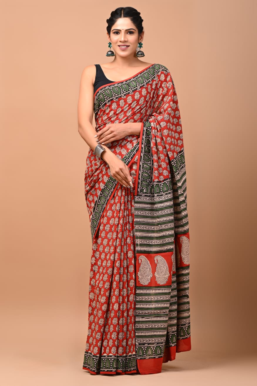Bagru Handblock Printed Mulmul Cotton Batik Red Saree