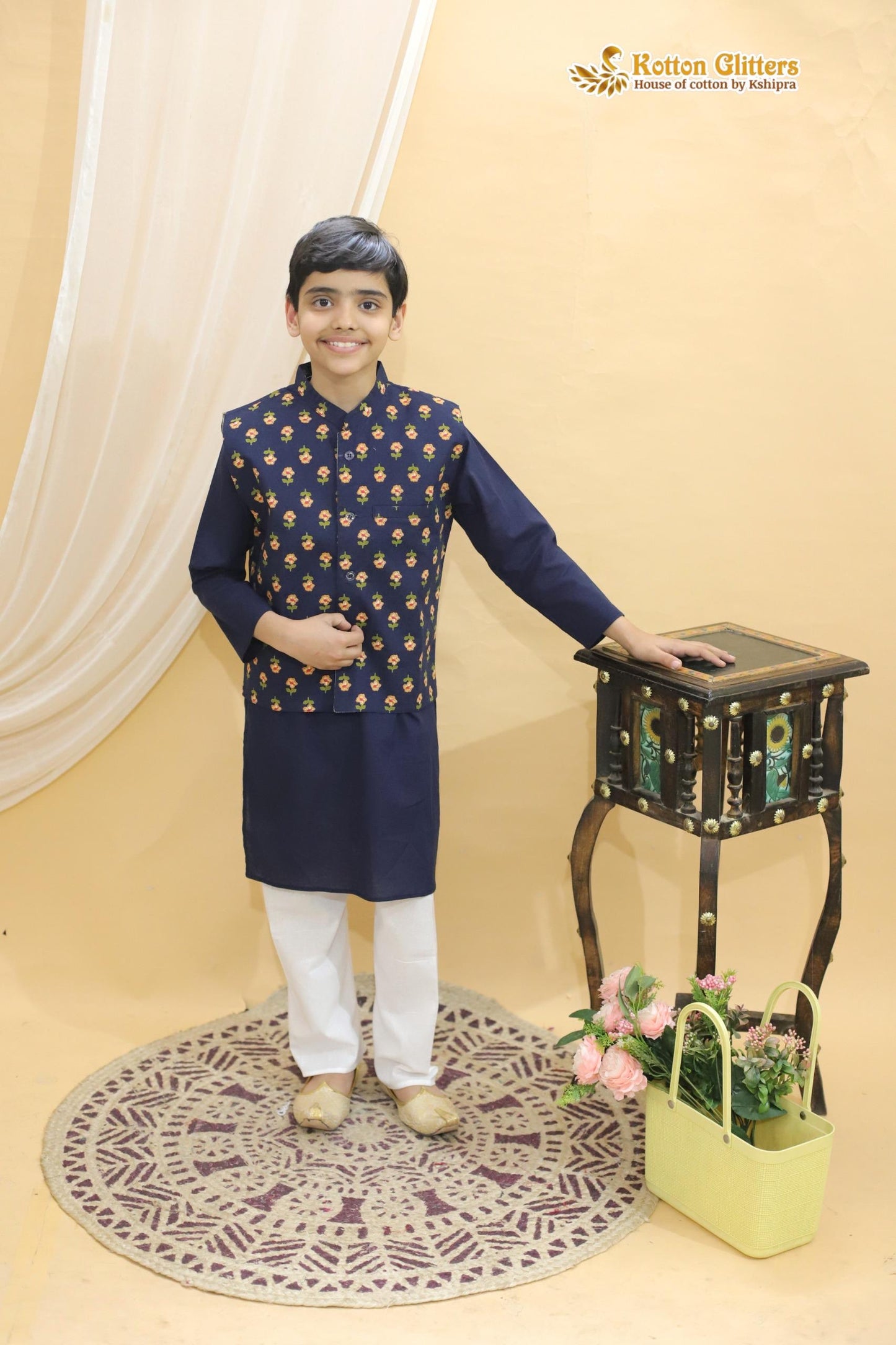 Pure cotton Plain Kurta and white pajama with Flower printed Jacket, Color: Navy Blue, comfortable fabric for kids skin; suggest first wash Dryclean