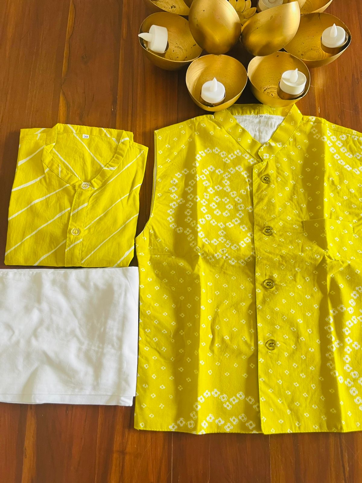 Pure cotton Yellow Bandhej Print Kurta Pajama Jacket Set