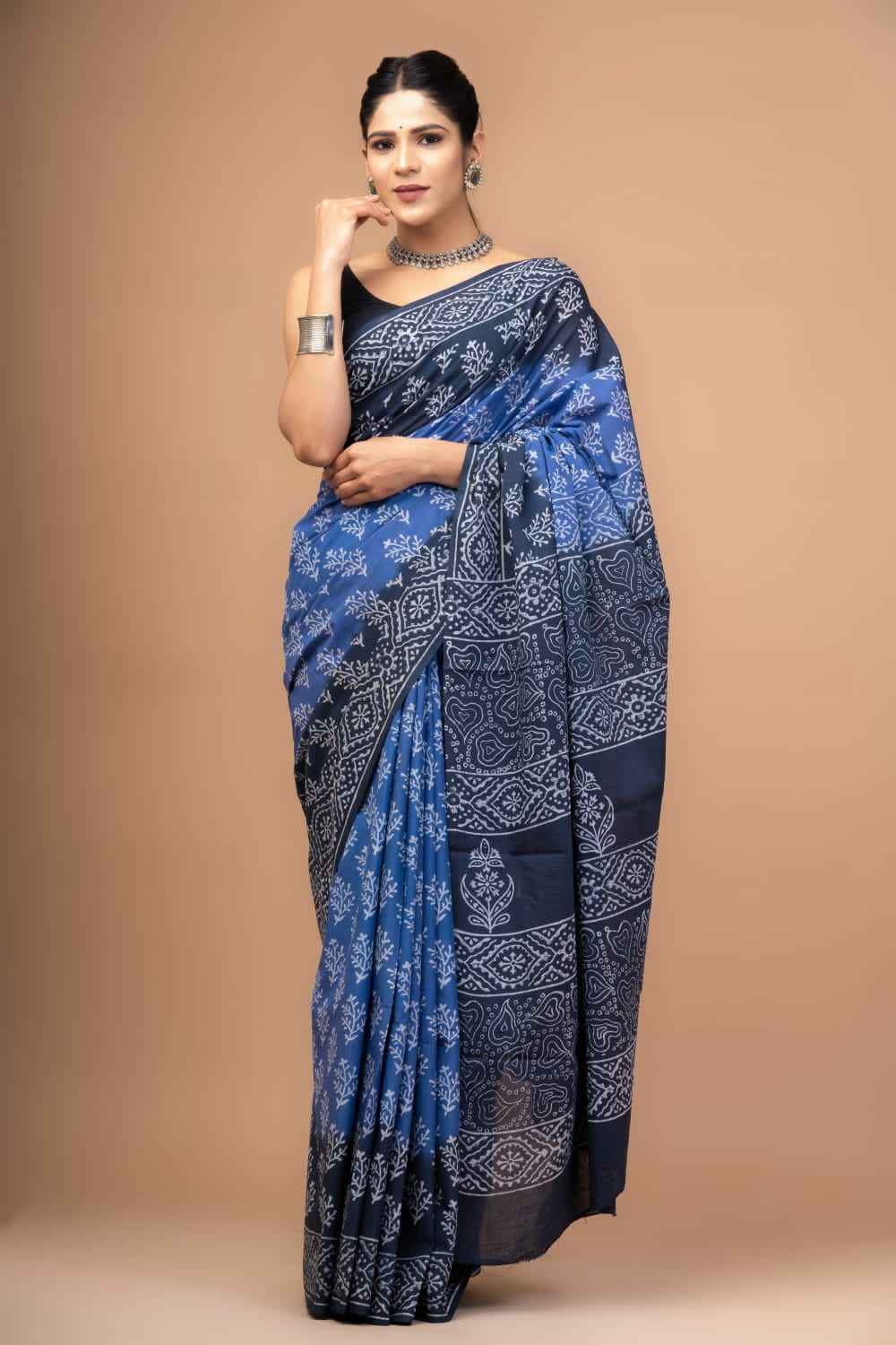 Bagru Handblock Printed Mulmul Cotton Blue Daisy Saree