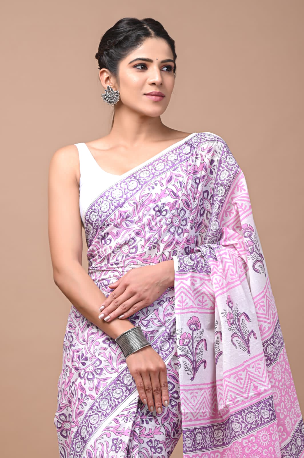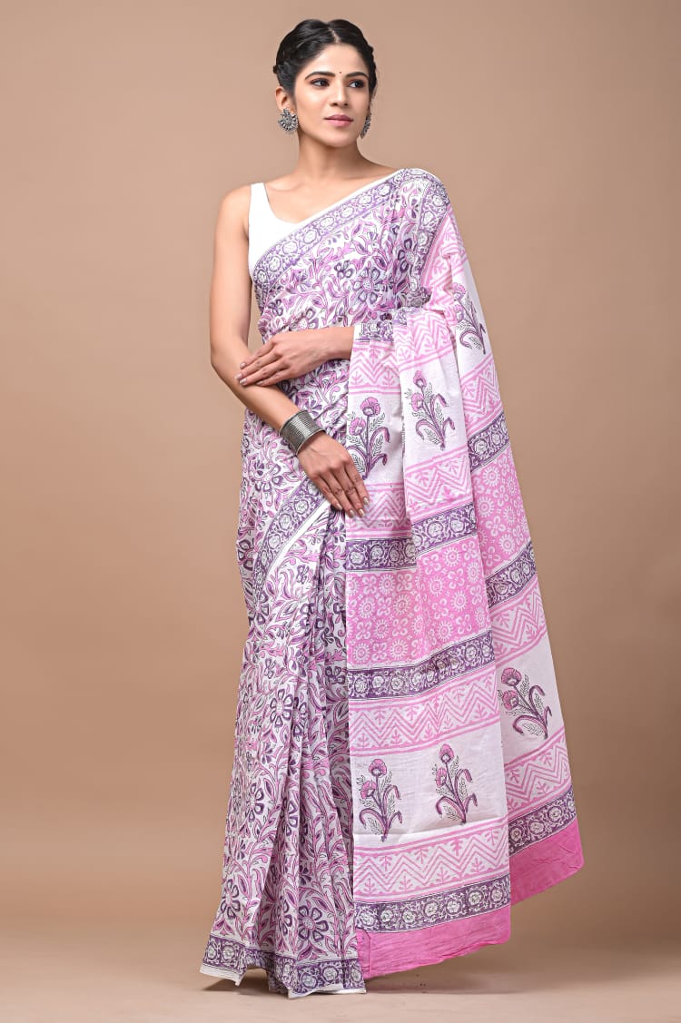 Bagru Handblock Printed Mulmul Cotton Pink Flower Saree