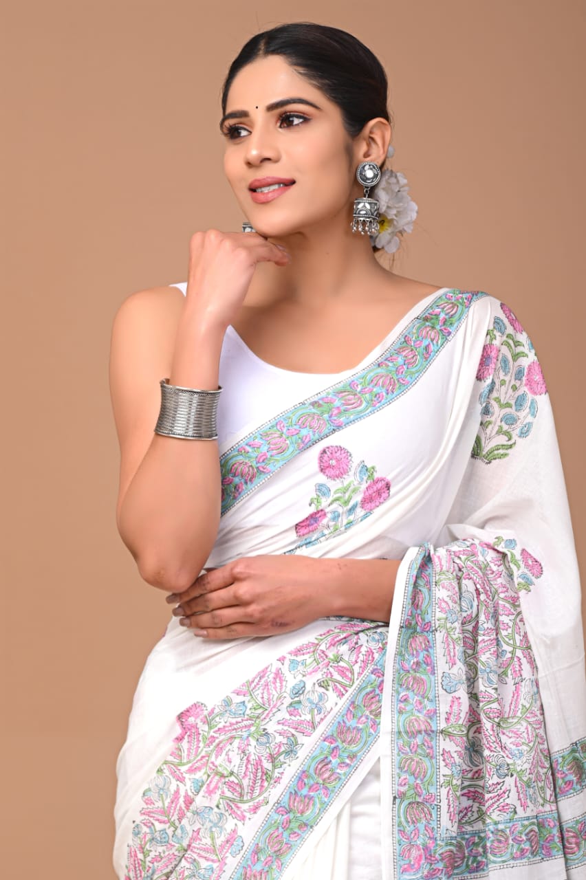 Bagru Handblock Printed Mulmul Cotton White Pink Saree