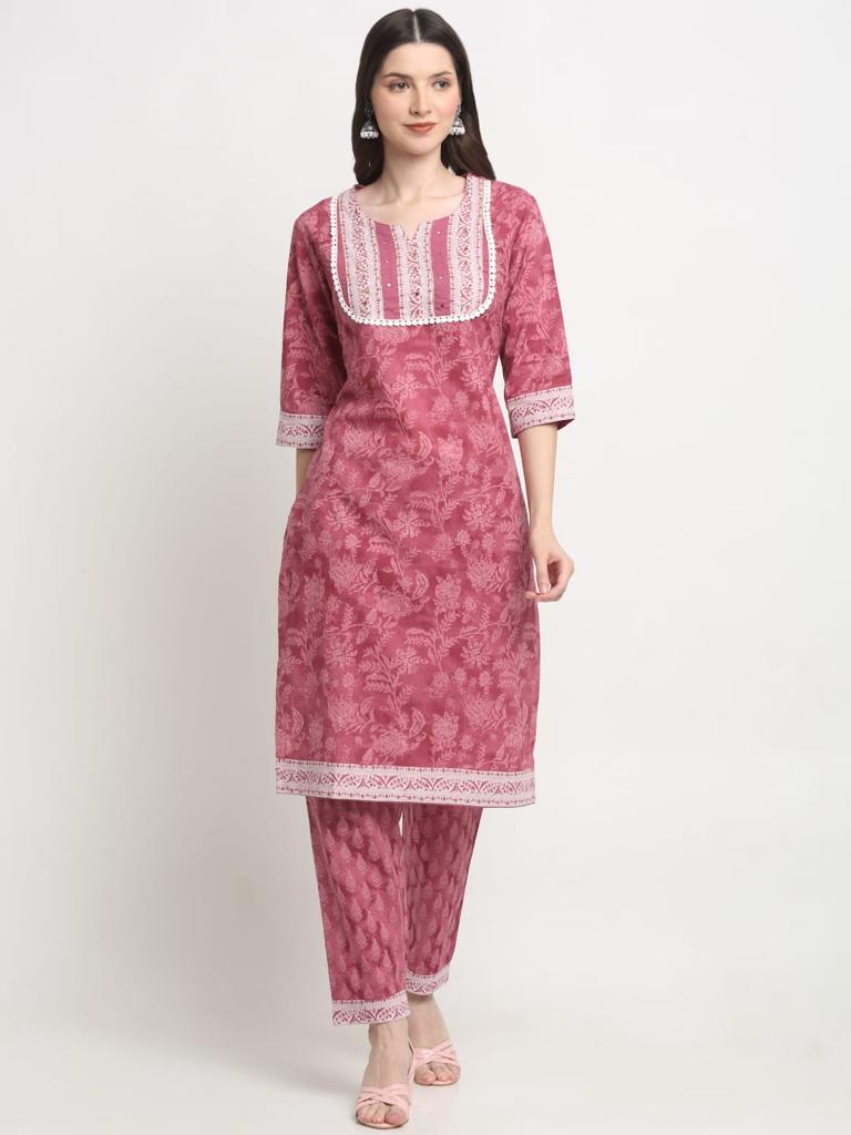 Beautiful Flower Printed Wine Color Cotton Kurti Pant Set