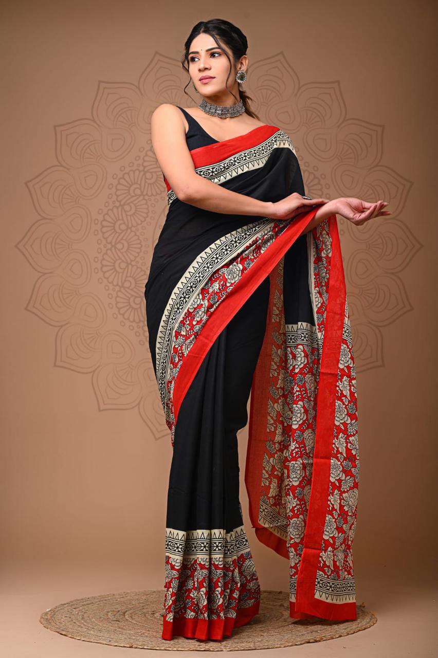 The traditional handblock print is done by artisans in bagru, Rajasthan. The saree is so light and comfortable to wear all day long, whether it's at work or house gatherings. This saree is best for gifting purposes. This is 5.5meter cotton saree. Quality Assured. No color bleeding and home washable. 1meter extra blouse.