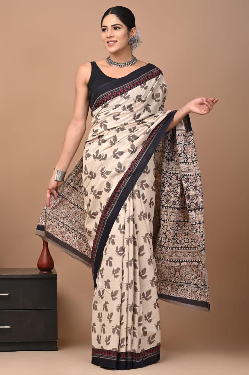 Bagru Handblock Printed Mulmul Cotton Fall Leaf Grey Saree