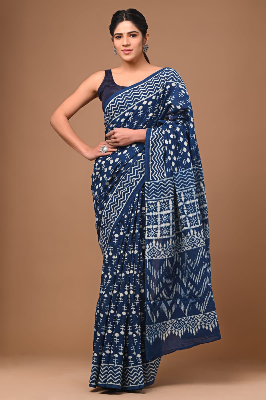 Bagru Handblock Printed Mulmul Cotton Indigo Lehariya Saree